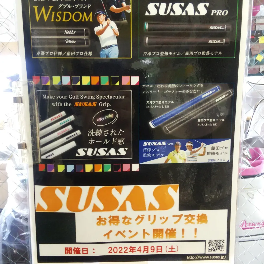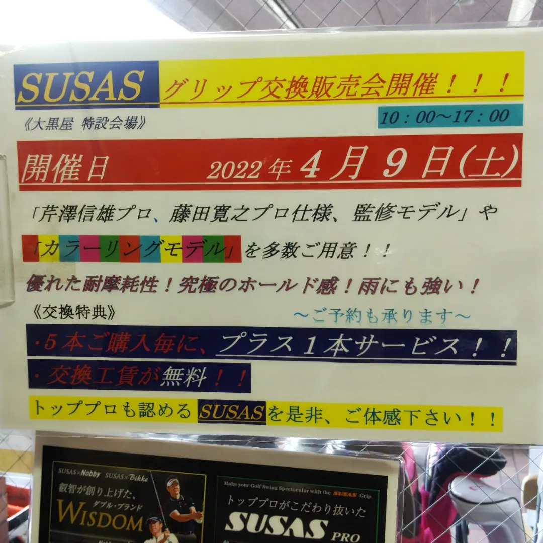 当イベント限定で、即日お渡し及び、交換工賃無料なのと、5本替えて頂きますと、もう1本を無料サービス致しますので、グリップ交換を検討中の方は、この機会にぜひ、当店のスウサスグリップ交換会に、ご来場くださいませ。