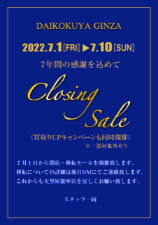 さて、このたび大黒屋銀座店では、店舗移転のため7月1から7月10日までの10日間