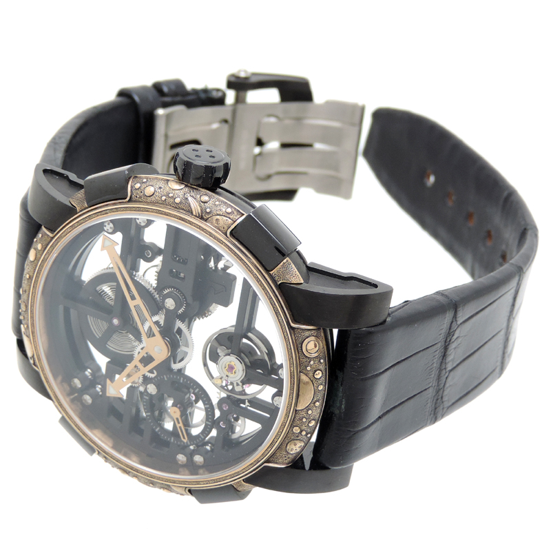 非常に精巧にエングレービングされたピンク ゴールドのベゼルとブラック ケースのコントラストが、時計のユニークな特徴を引き立てていて1本の制作には8週間が手作業により費やされるという芸術作品となっています。