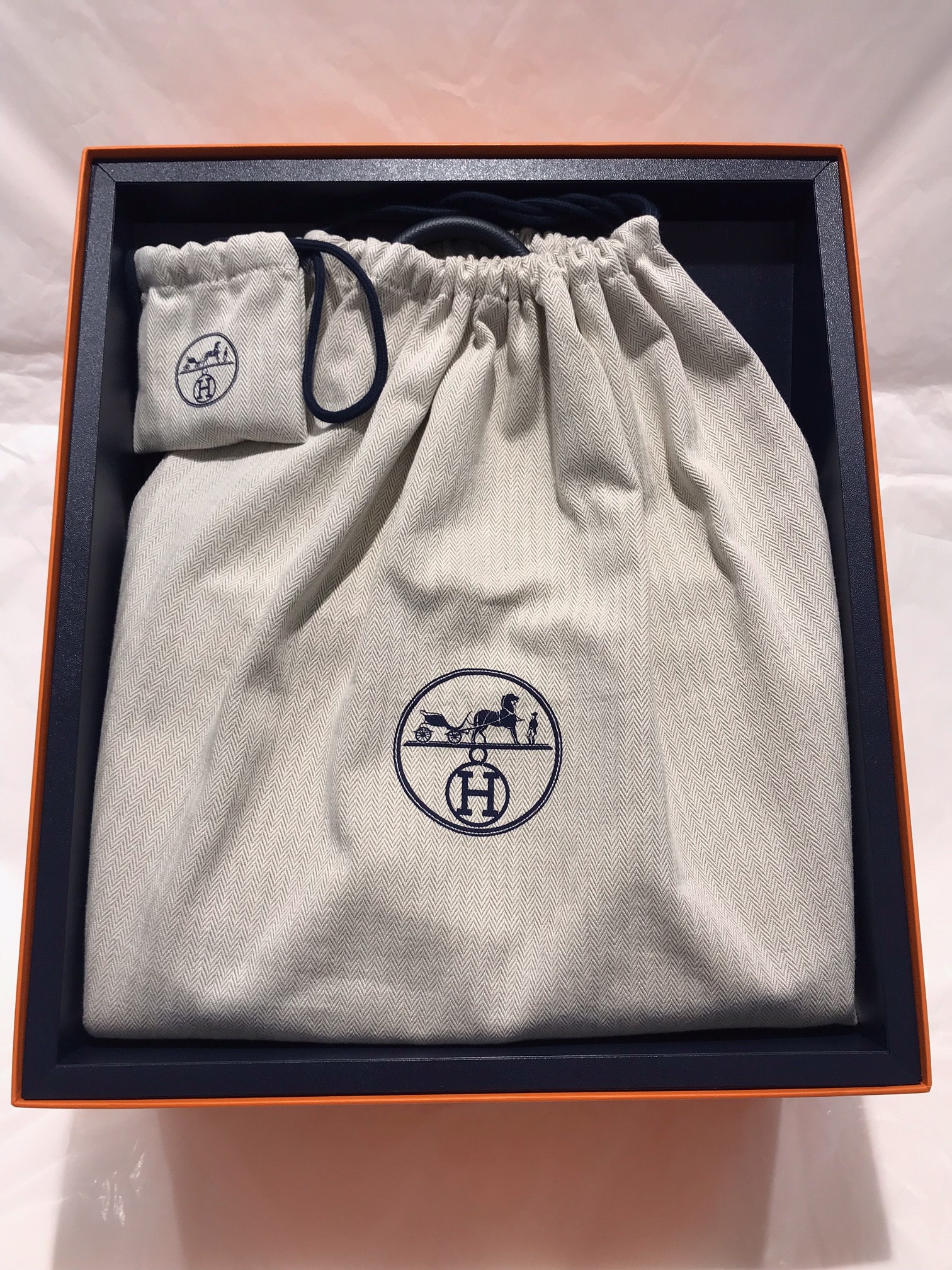 保存袋も通常はブラウンが使用されるロゴと紐までも、箱の内側と同様にネイビーで統一されているプレミアムな仕様です。
