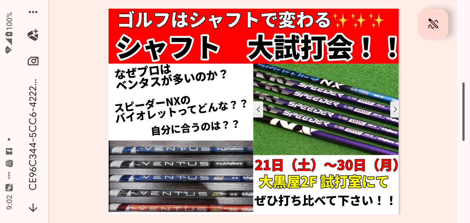 用意する試打シャフトは、新発売の「スピーダーNXバイオレット」や「24ベンタスブルー」「ベンタスTRブラック」などを予定しておりますが、変更や追加する場合がございますので、ご了承くださいませ。