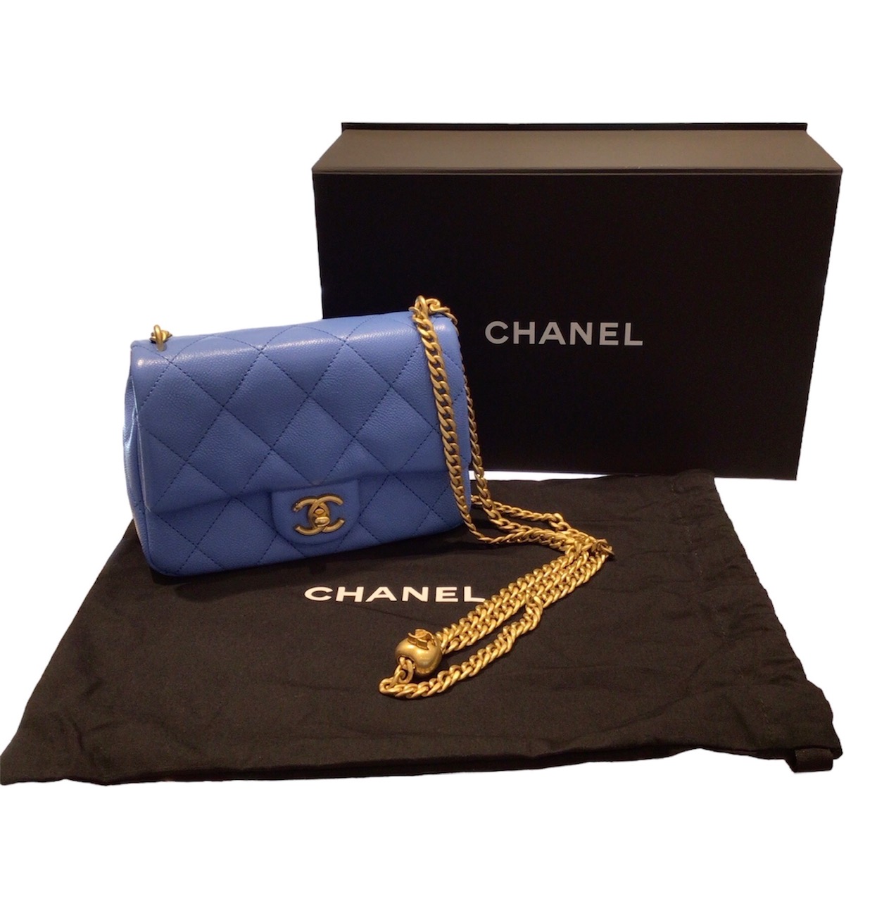 The elegant caviar skin and cute blue mini matelasse chain shoulder gives it a