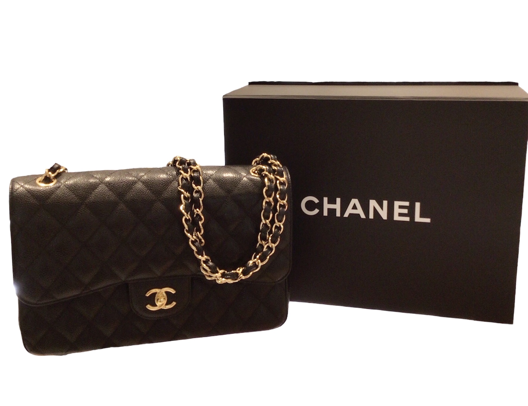The combination of black caviar skin and gold hardware gives it a luxurious feel.