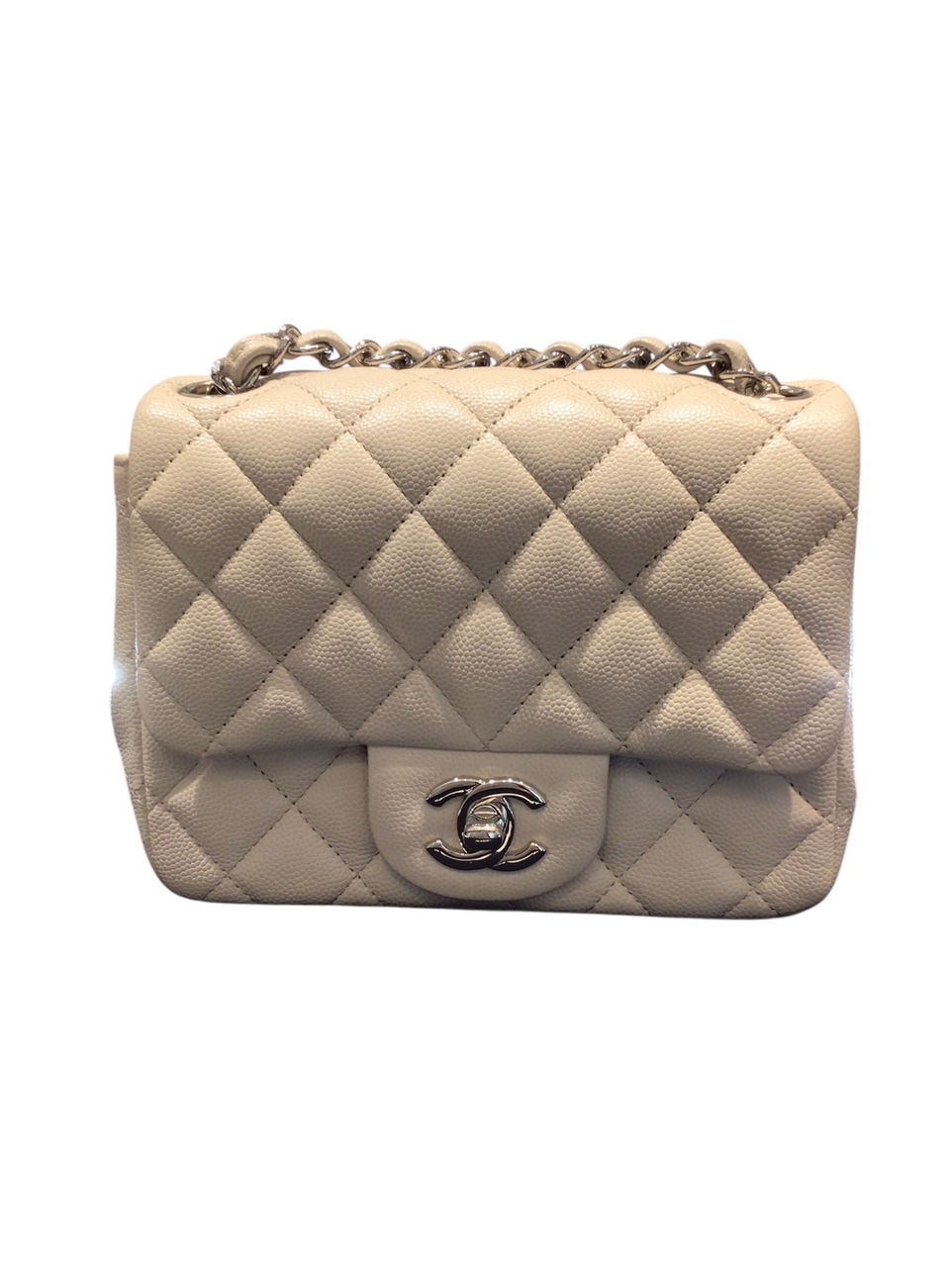 上品なキャビアスキンとアイボリーが可愛いチェーンショルダーは、