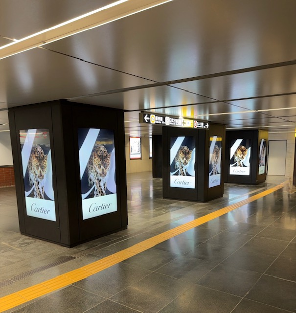 オープンにさきがけ、銀座の街や駅ではサイネージやシート広告がジャックされ、