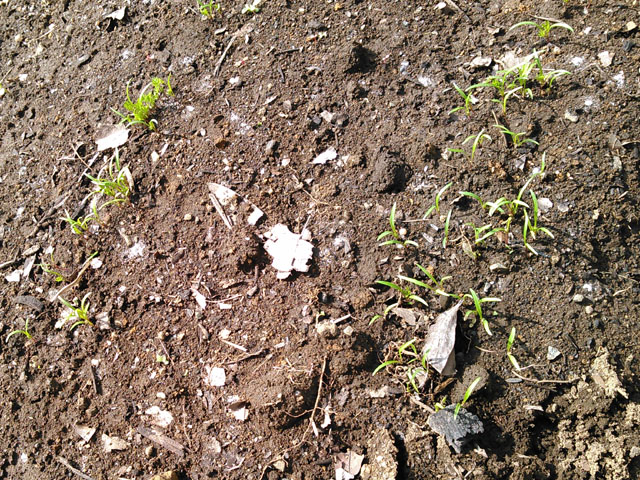 ニンジンの芽でぇす!まだまだ小さいですね。もう少ししたら間引こうかな。