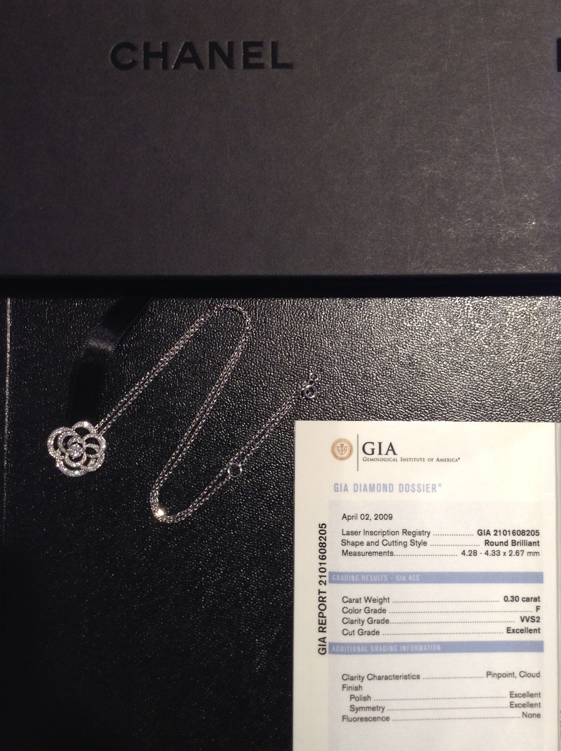 センターのダイヤが0.30ct/Fカラー/VVS2/エクセレントカット(GIAの鑑定証付き)、とてもクオリティの高いエレガントなネックレスです。