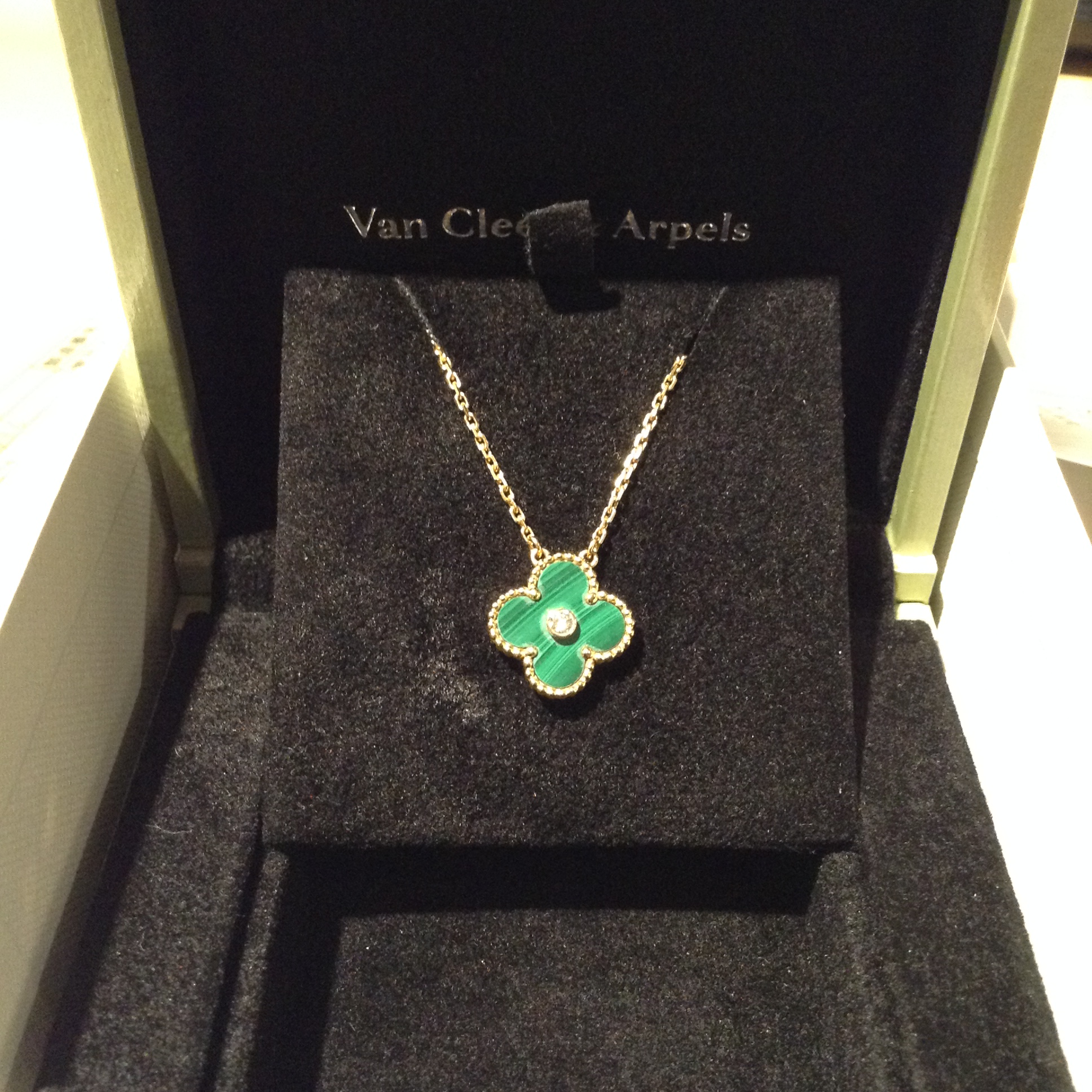 ふたつ目はヴィンテージアルハンブラネックレス、2013年クリスマス限定品のマラカイトに1Pダイヤが入ったレアな逸品です。