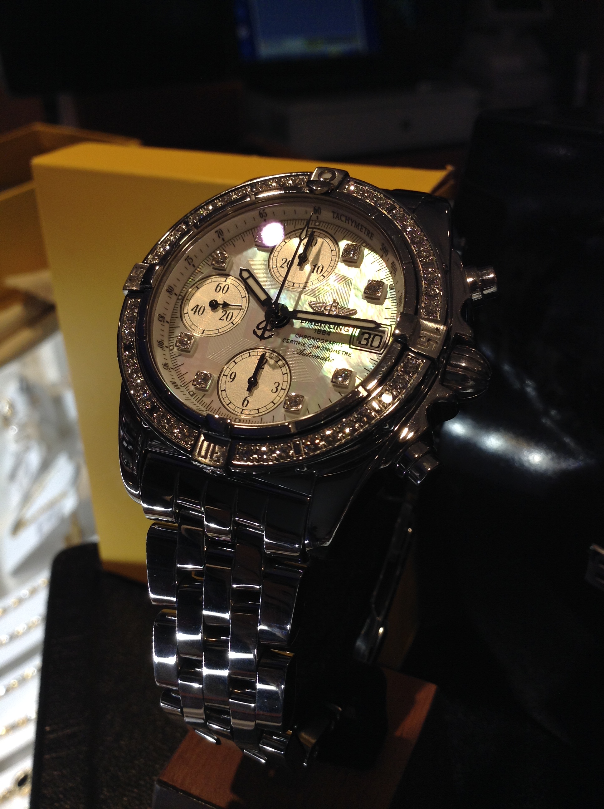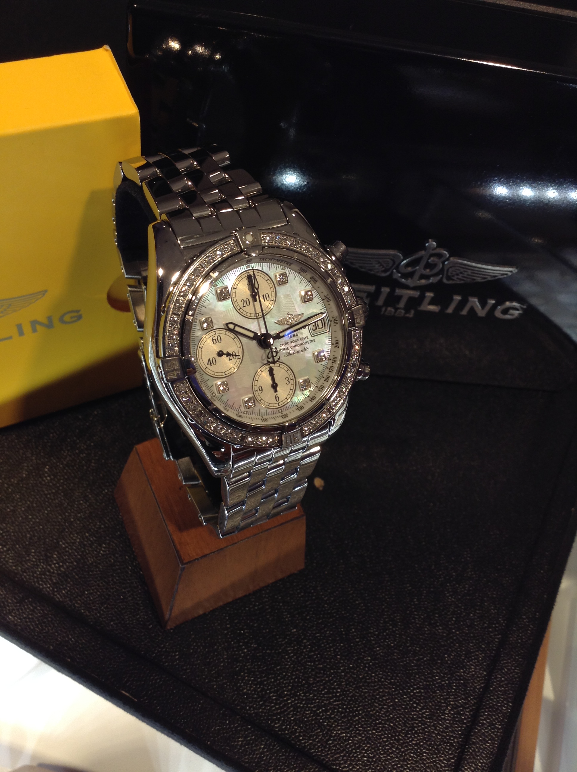 ブライトリングと言うと大きめで厚みのあるケースで圧倒的な存在感があるイメージが強いですが、こちらのモデルはケース径約39mm、文字盤に華やかなマザー・オブ・パール(ホワイトシェル、白蝶貝)も採用し、ベゼル、ダイヤルインデックスには贅沢にダイヤモンドをあしらった非常に上品なモデルです!