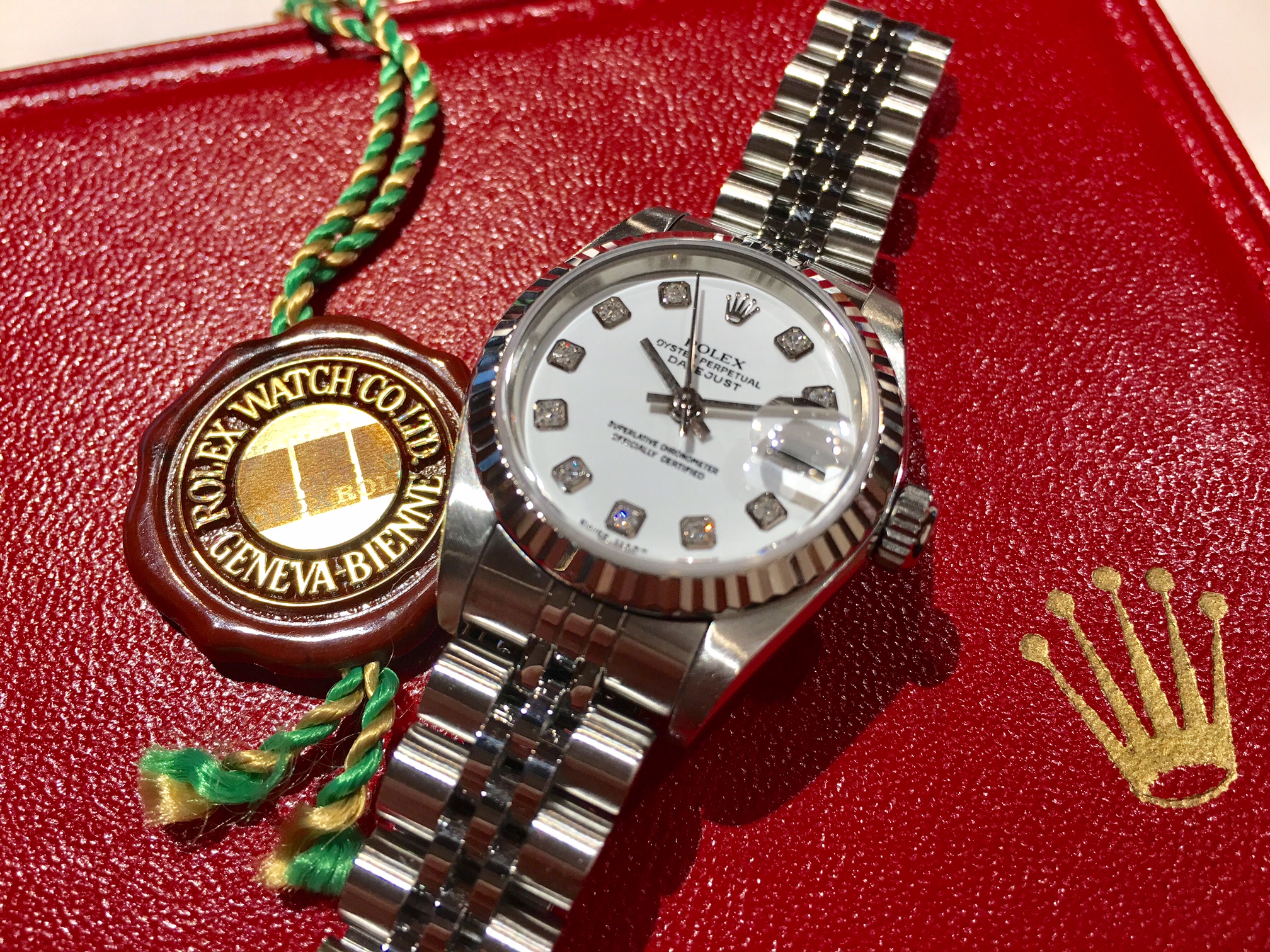 今回買取をしたモデルは視認性に優れたホワイトダイアルに綺羅びやかな10ポイントのダイヤモンドをセッティングし、上品なステンレススティール製のジュビリーブレスレット、さらに750WG(K18ホワイトゴールド)素材のフルーテッドベゼルを採用することで落ち着いた印象ながらも高貴な雰囲気を纏い、様々なシチュエーションで着用可能なオススメのお品です♪