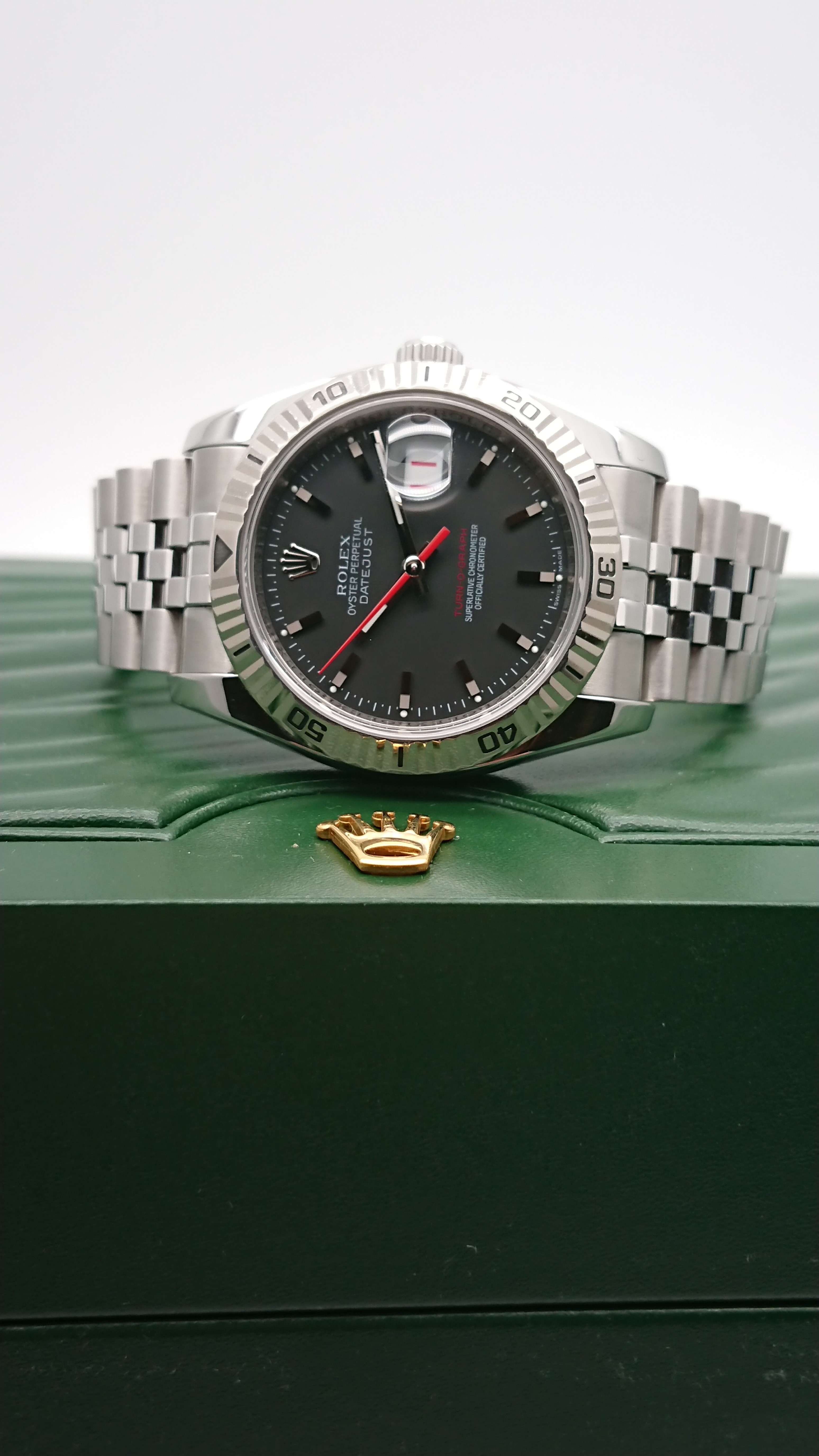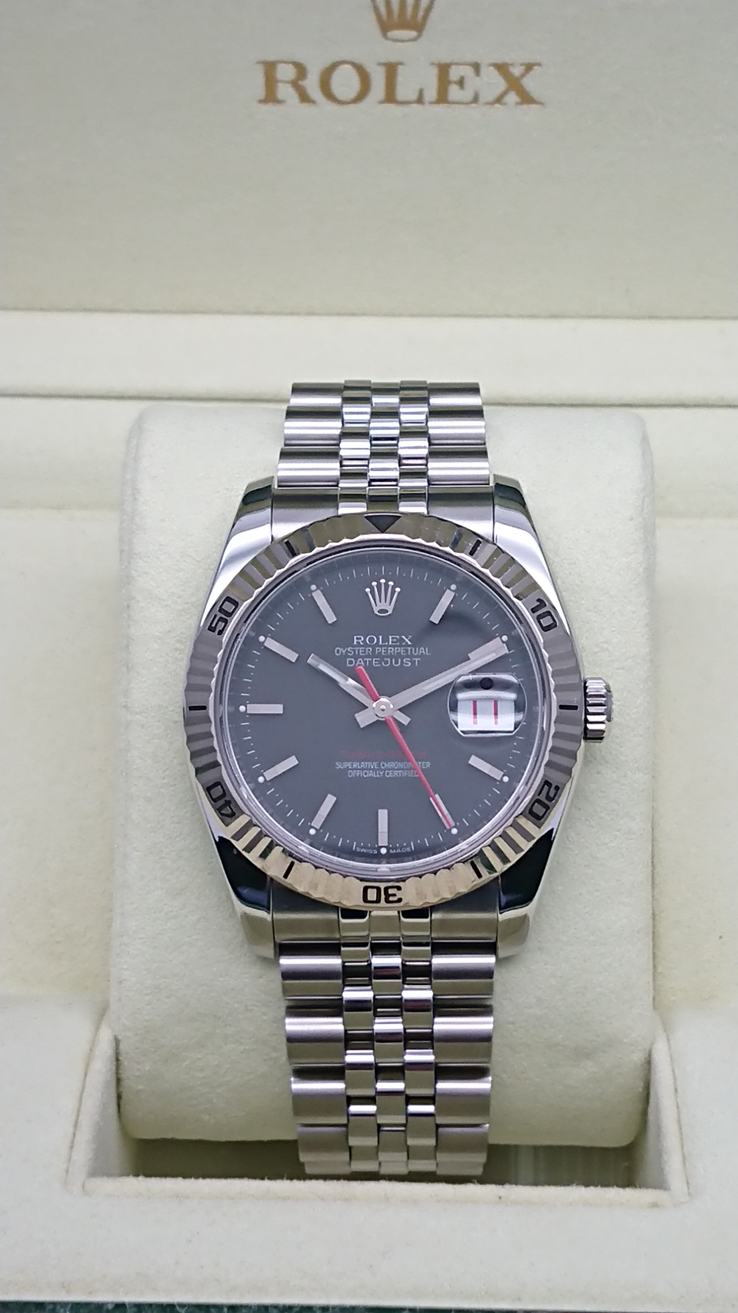 デイトジャストの派生モデル、ターノグラフ(Ref116264)はサンダーバード(Ref16264)の後継機種として2004年に登場しました。(2013年で生産終了)