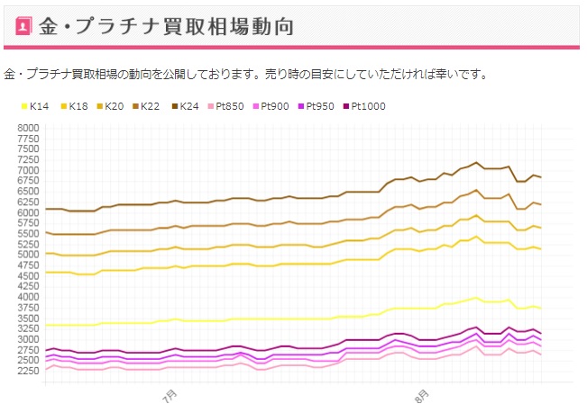 そして、前回記事を書いた7月ではK18 = ¥4,800/g、K24 = ¥6,350/gになり、かなりの高騰金額となっておりました。