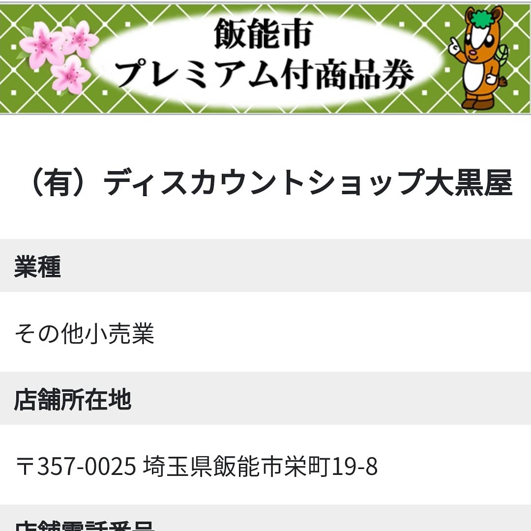 こんにちは、DS大黒屋飯能本店の野崎です。 当店では、飯能商工会議所発行の商品券「飯能市プレミアム付商品券」がご利用できます。 使用開始は、11月7日(土)からとなっていますので、プレミアム商品券を購入できた方は、ぜひ大黒屋でお使いください。